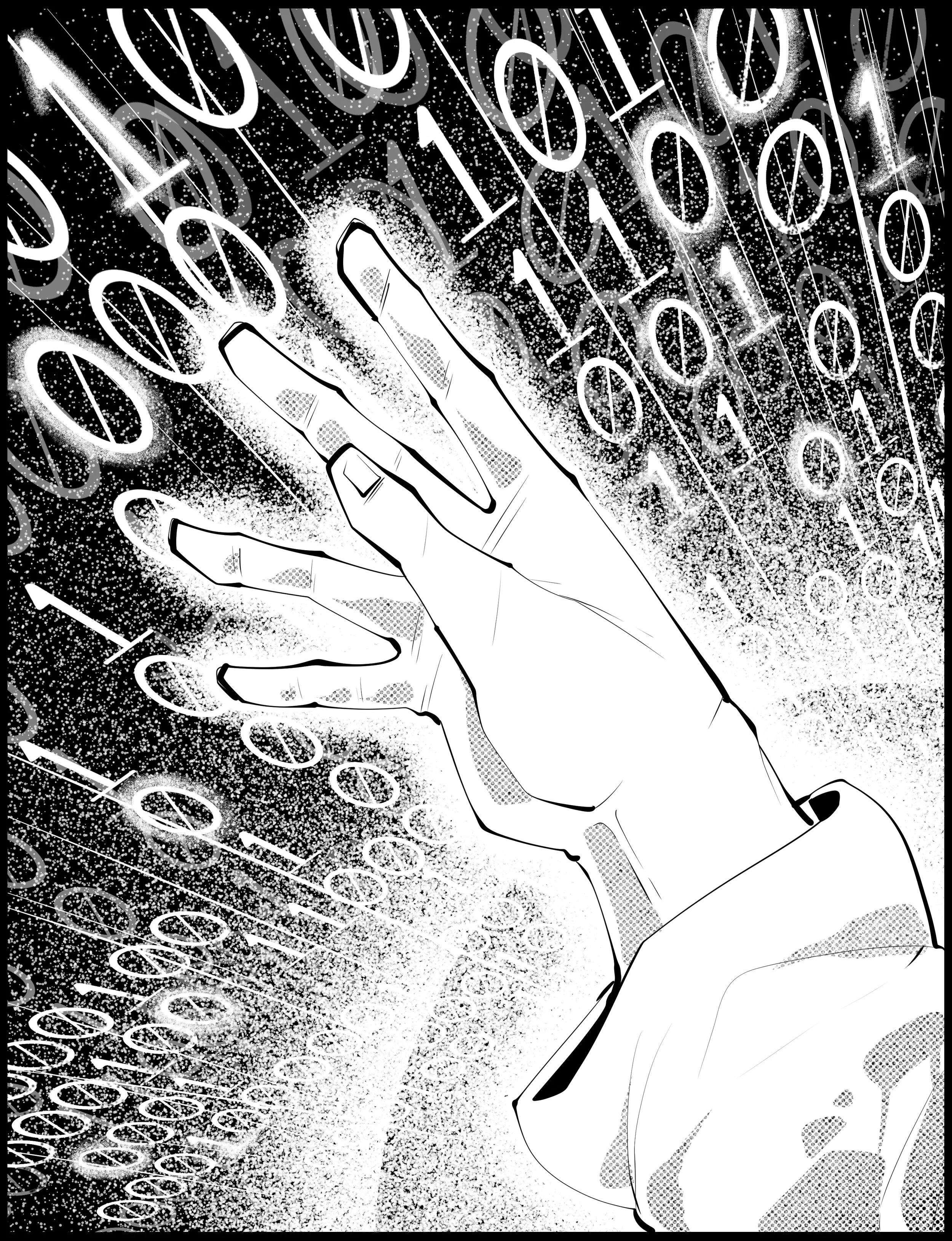 The code begins executing its task. Zeroes and ones flash and swirl, dutifully progressing through each line. Finally, a figure takes form. Pixels gather slowly, revealing fingers and a hand reaching out, grasping at the air.