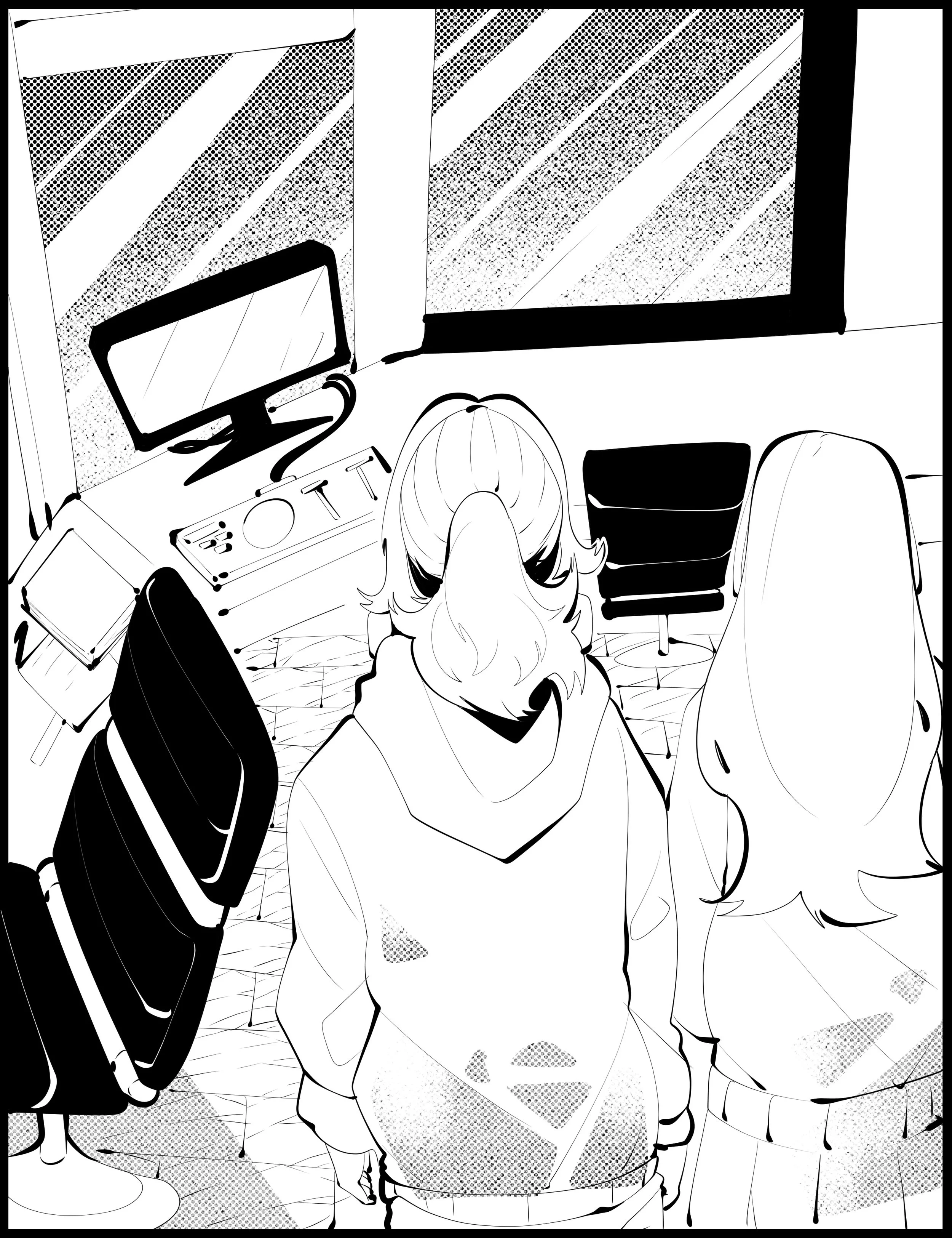Where did we come from? How did we end up here? Kai stands, offering a hand to help her up, but his grip is gentle, as if he's unsure of himself. They survey the room, a recording studio filled with guitars, drums, and other equipment.